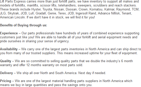 For your entire fleet of lift-trucks, we offer the best deals on all our parts. If you are interested in getting an estimate for our attachments or parts, give us a call today at: